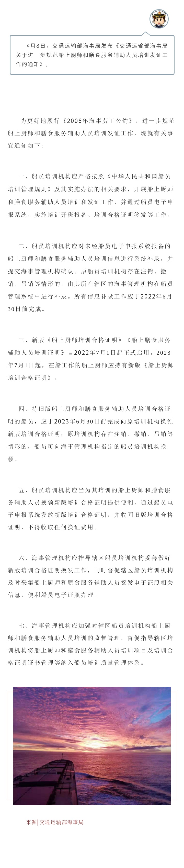 【最新政策】交通運輸部海事局關于進一步規(guī)范船上廚師和膳食服務輔助人員培訓發(fā)證工作的通知